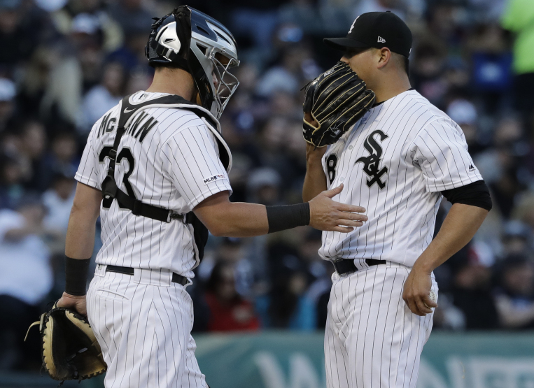 White Sox beginning pitcher Manny Banuelos, proper, talks with catcher James McCann through the third inning of a baseball sport in opposition to the Boston Red Sox in Chicago, Saturday, May 4, 2019. (AP Photo/Nam Y. Huh)