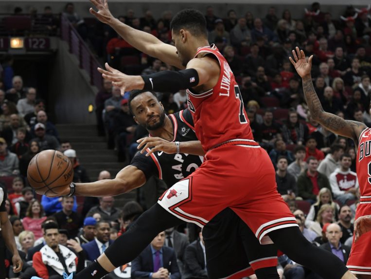 Toronto Raptors’ Norman Powell, left, passes the ball round Bulls’ Timothe Luwawu-Cabarrot within the first half of the Raptors’ 124-101 victory Saturday night time on the United Center. The Bulls dropped to 21-56 with their fourth consecutive loss. | Paul Beaty/AP picture