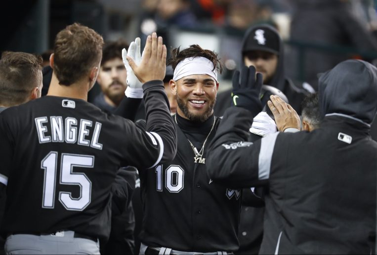 Yoan Moncada (10) celebrates scoring on a Jose Abreu double throughout the seventh inning in Detroit. (AP Photo/Paul Sancya)