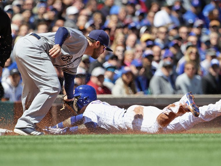 Cubs shortstop Javy Baez is caught attempting to steal third base by Mike Moustakas of the Brewers within the second inning at Wrigley Field on Friday. (Photo by Jonathan Daniel/Getty Images)